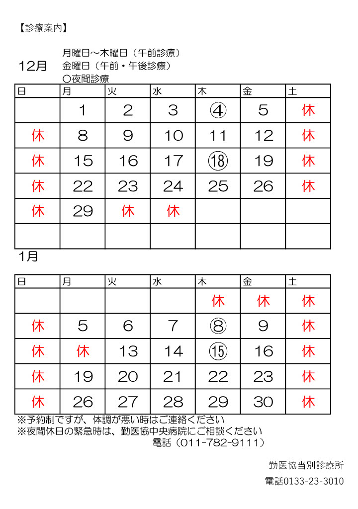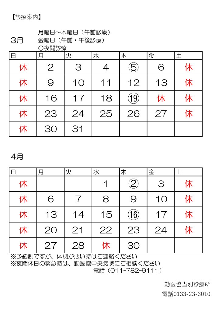 | 夜間 | ※夜間診療 (第1、第3のみ) |